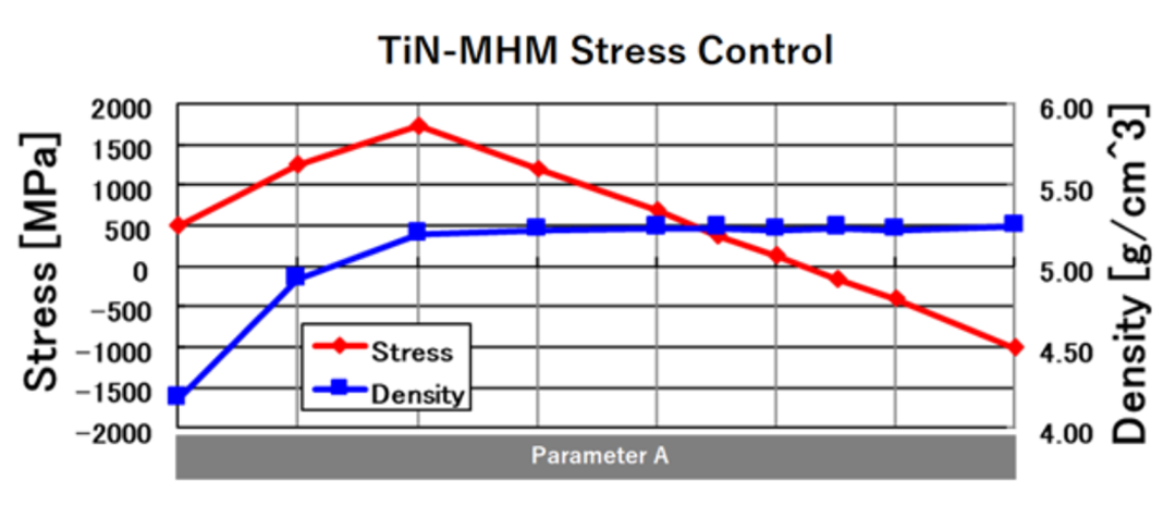 1. 高密度TiN膜の自在な応力制御(グラフ参照)